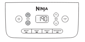 - Press the AIR FRY button. The default temperature setting will display. Use the TEMP up and down arrow buttons to set your desired temperature.