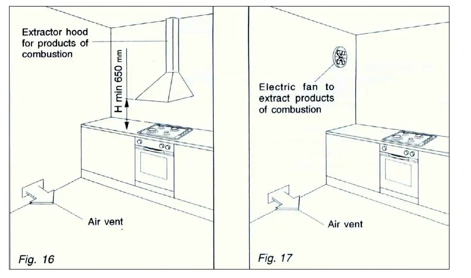 Extractor hoods connected directly to the outside must be provided, to allow the products of combustion of the gas appliance to be discharged (fig.16).