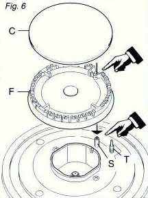 When fitting the wok burner together, it is very important to check that the burner flame distributor (F) and the cap (C) are correctly positioned (fig. 6). Failure to do so can cause problems with ignition and also the way in which the burner operates.