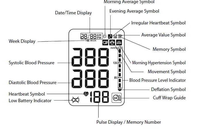 Display Symbols Irregular Heartbeat Symbol, Morning Hypertension Symbol, Movement Error Symbol, Average Value Symbol