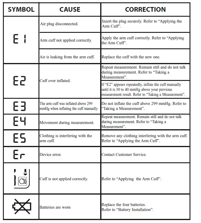 The Movement Error Symbol is displayed if you move your body during the measurement. Please remove the arm cuff, and wait 2-3 minutes. Take another measurement, remain still during inflation.The American Heart Association1 recommends the following guideline for upper limit of normal for home blood pressure readings:This is a general guideline because blood pressure depends on age and morbidity. The AHA recommends a lower home blood pressure goal for certain patients, including diabetic patients, pregnant women, and patients with renal failure1.