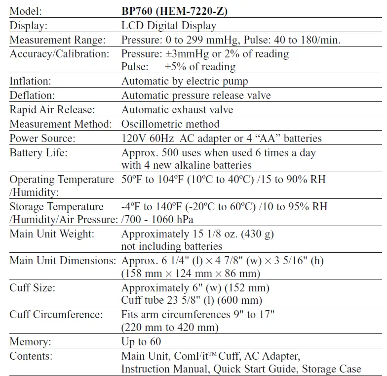Thank you for purchasing the Omron® BP760 IntelliSense® Automatic Blood Pressure Monitor with ComFitTM Cuff.Your new digital blood pressure monitor uses the oscillometric method of blood pressure measurement. This means the monitor detects your blood’s movement through your brachial artery and converts the movements into a digital reading. An oscillometric monitor does not need a stethoscope so the monitor is simple to use.BP760 comes with the following components:• Monitor