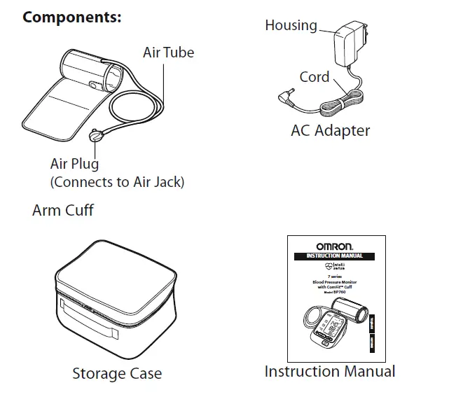 The Omron Blood Pressure Monitor comes with a monitor, storage case, instruction manual printed in English and Spanish, quick start guide, ComFit cuff, and AC adapter.