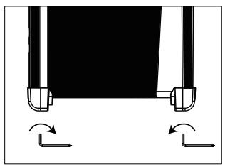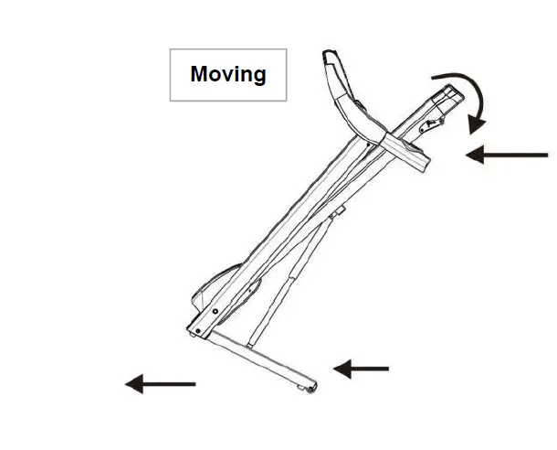 - Moving the treadmill: Make sure the treadmill is securely folded and unplugged. With both hands on the handles pull the top of treadmill towards yourself to tilt it until the rollers are engaged on the floor. You can now freely wheel the treadmill to a storage location.