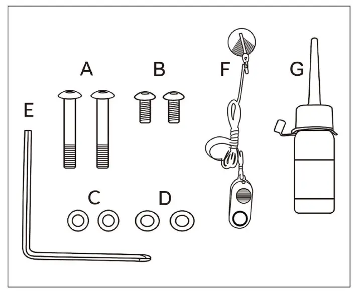 - Fasten the left and right stand columns to the main frame with screws shown in following picture. Fix 2 Bolts (A) and 2 Flat Washers (C) by Allen Wrench (E).