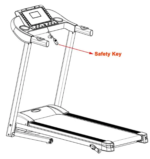 This treadmill will only be operated when the magnetic safety key is inserted onto the console. Put the safety clip on your clothing when you are using the treadmill. The string will pull the magnet out of the lock turning the treadmill off if you fall or move from the treadmill. Please do not lose the safety key as it would not be easy to operate without it.