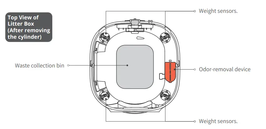 - Weight sensor: the interior of the litter box is equipped with 4 weight sensors. If a cat enters the litter box, these sensors will detect the cat and cease the operation.