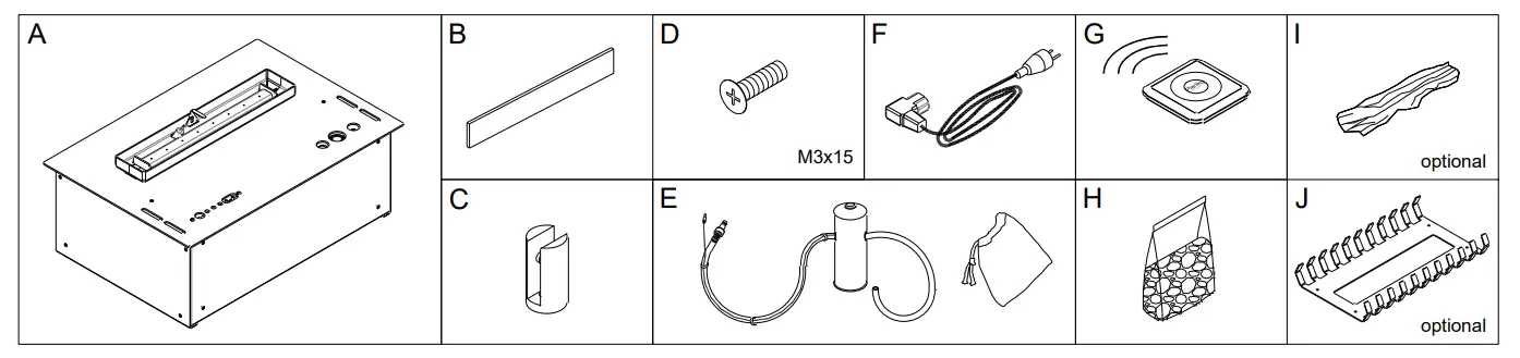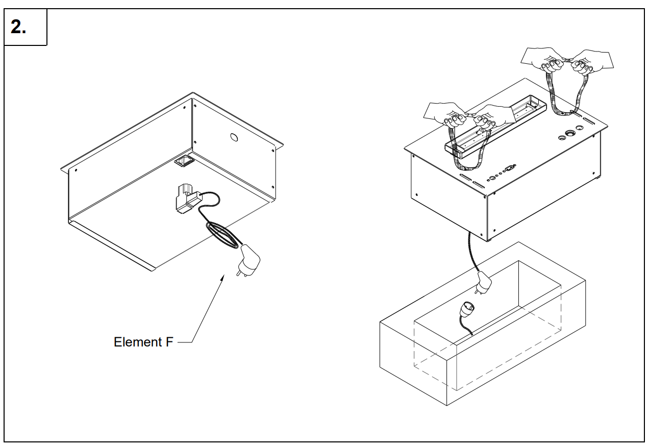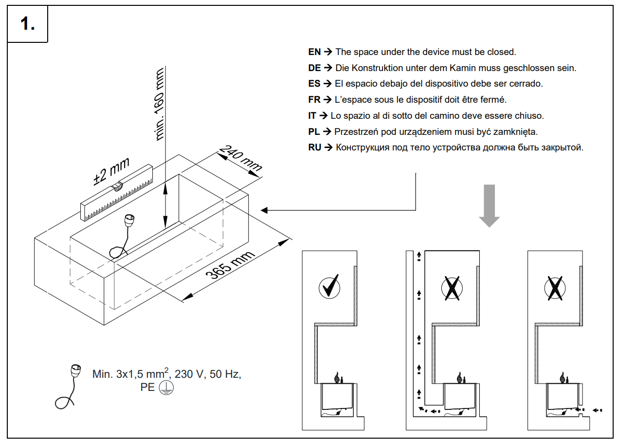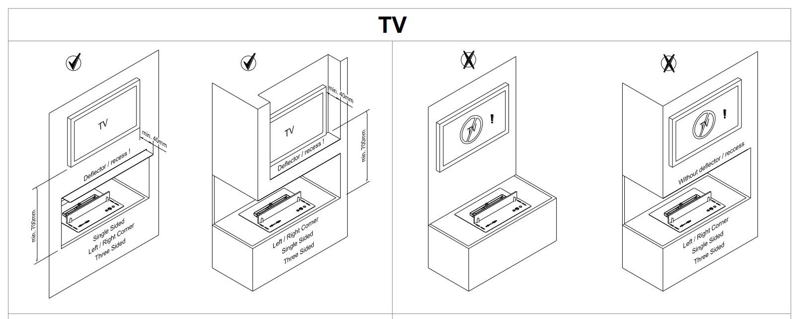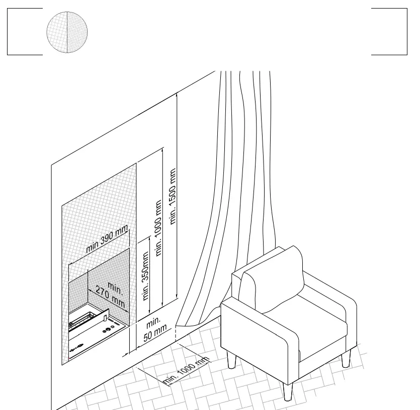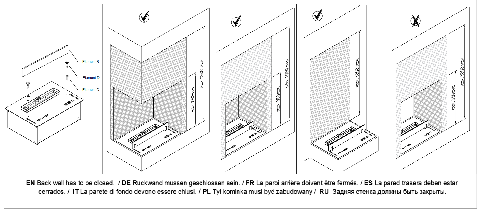The fireplace surrounding must be made of non-flammable materials and insulated from any flammable elements of the construction. Use only fasteners and adhesives that are resistant to high temperature