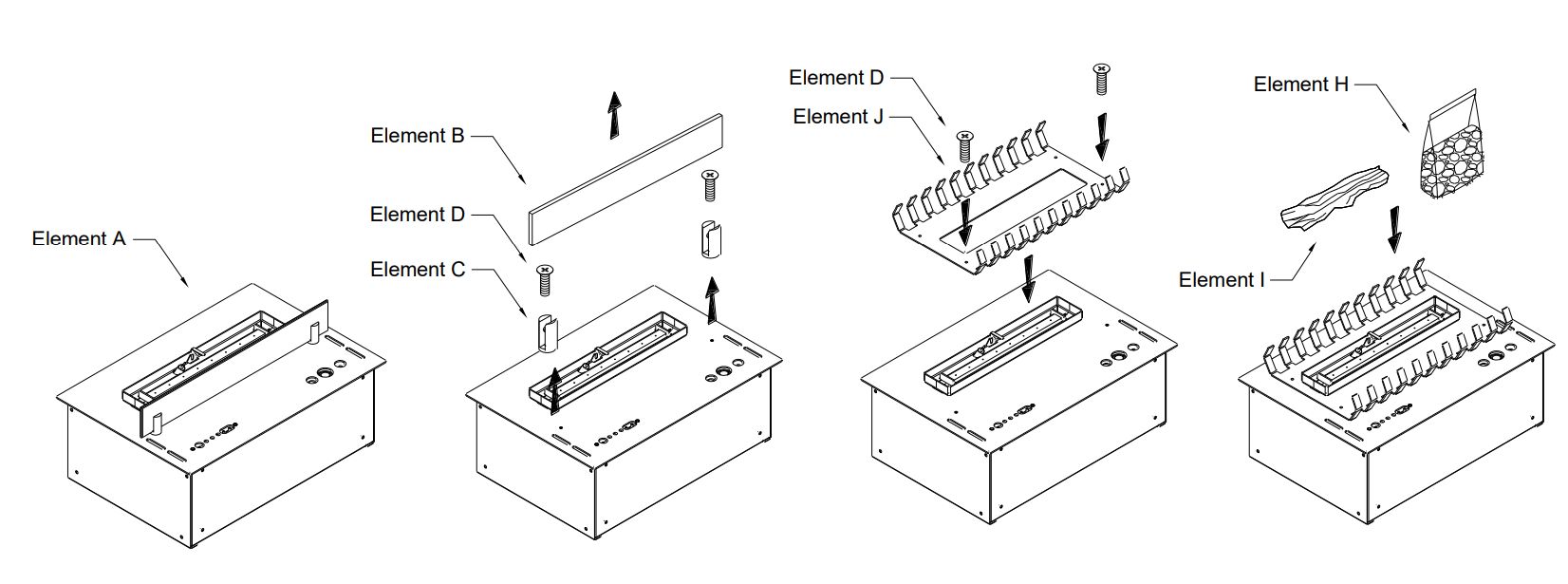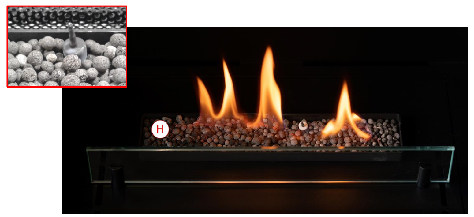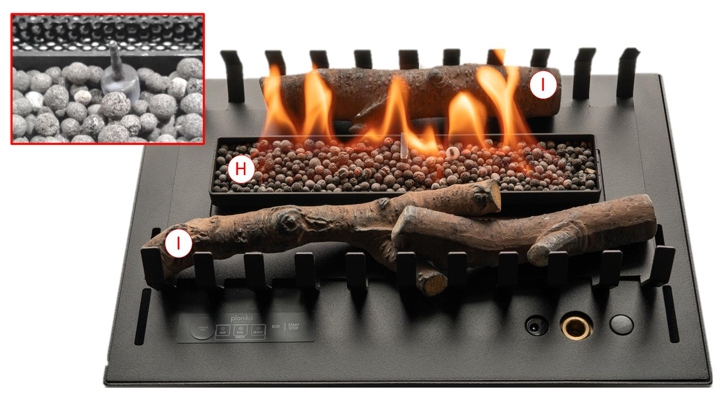 Place the granules (H) evenly in the marked area leaving no uncovered area. Make sure the granules are not in contact with the filament. Put the ceramic logs according to the scheme in the picture (I).