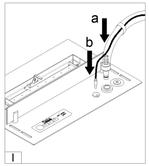 ). - Disconnect the power cable ‘b’. To disconnect the pump, hold the end of the hose and firmly press the button in the place marked with a sticker ‘a’ (V).