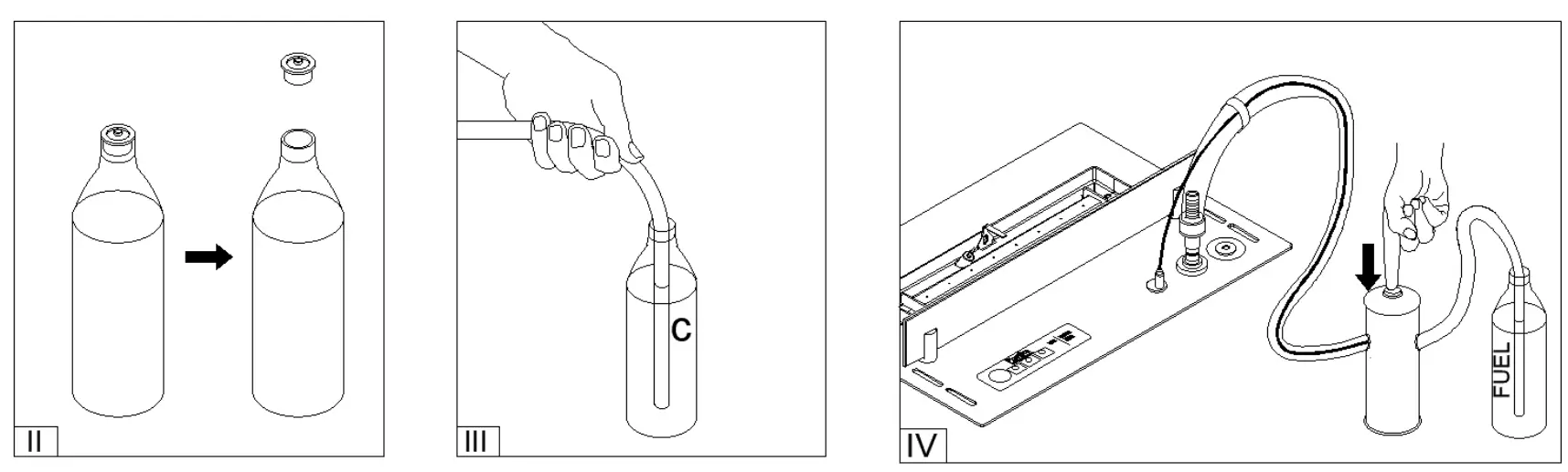 - 2. If the fuel bottle is secured with the flame restrictor (cap on the bottles’ neck) (II) please remove it before inserting the fuel pump inlet (III) Place the fuel container stably on the floor and insert the pump hose ‘c’ (III). Press and hold the button on the pump to start refuelling (IV).