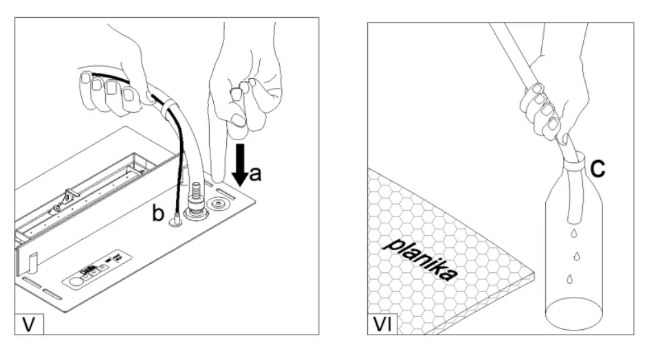 - Shake the remaining fuel from the hose ‘c’ to the container and place the pump in the bag (VI).