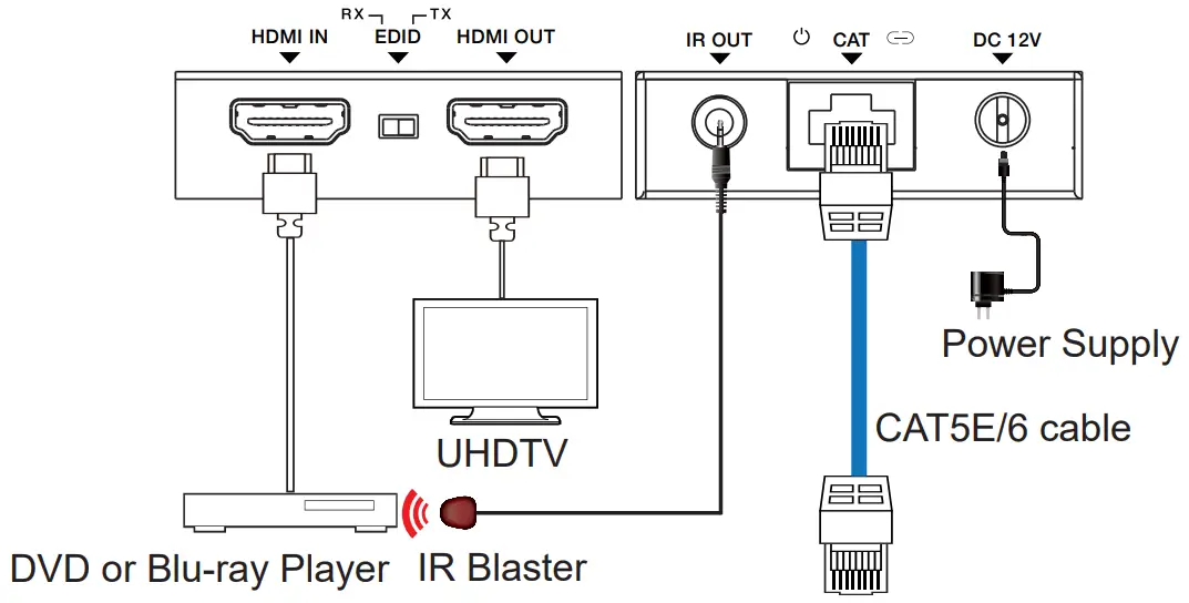 Receiver | Inputs: 1x IR IN [3.5mm Stereo Mini-jack] 1x CAT IN [RJ45, 8-pin female] Output: 1x HDMI Type A [19-pin female] |