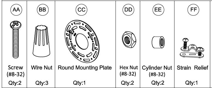 Lift up the fixture and pass the screws (AA) through the two mounting hole in the fixture canopy. While holding the fixture with one hand, thread the screws (AA) in or out of the round mounting plate (CC) until 3/16″ of threads are showing. That should be enough to mount the fixture as instructed in step 5.