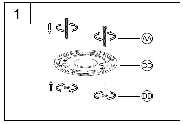 - Loosely thread the screws (AA) and the hex nuts (DD) onto the round mounting plate (CC) as shown. You now need to adjust the screw length according to the fixture canopy depth.