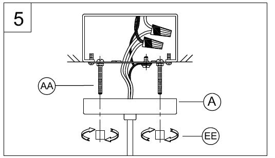 Connect the fixture ground wire and supply ground wire using a wire nut or by fastening to the ground screw on the round mounting plate. Push all wire connections into the outlet box. - Pass the screws through the two holes in the canopy. Secure the fixture (A) to the screws (AA) using the two cylinder nuts (EE) and tighten securely.