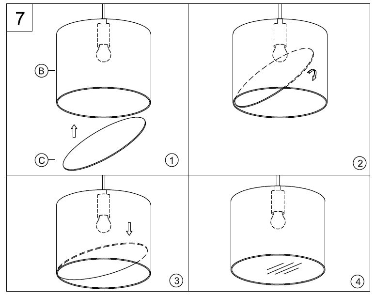 Thread the lamp (not included) into the fixture socket. Use 100-watt MAX incandescent medium base lamp, SBCFL or SBLED. - Following the 4 steps shown, place the diffuser (C) UP into the shade from the bottom (B) on an angle, then drop it down onto the perimeter wire.