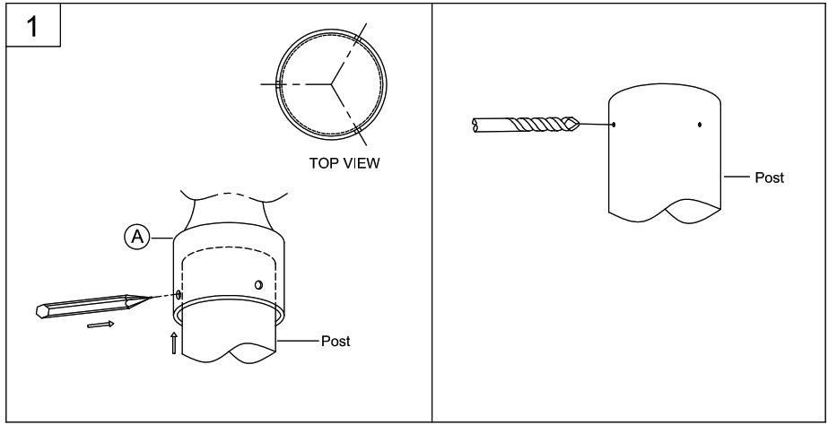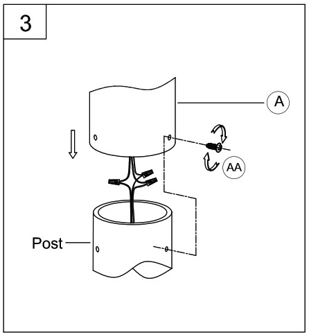 - Insert the fixture (A) onto the post and use the mounting screws (AA) to secure the fixture tightly to the post using the holes drilled in step 1.