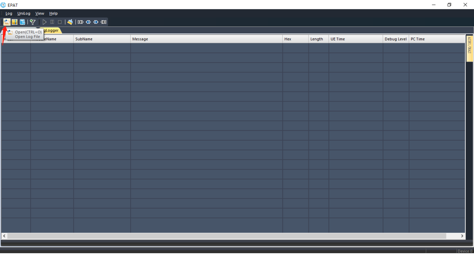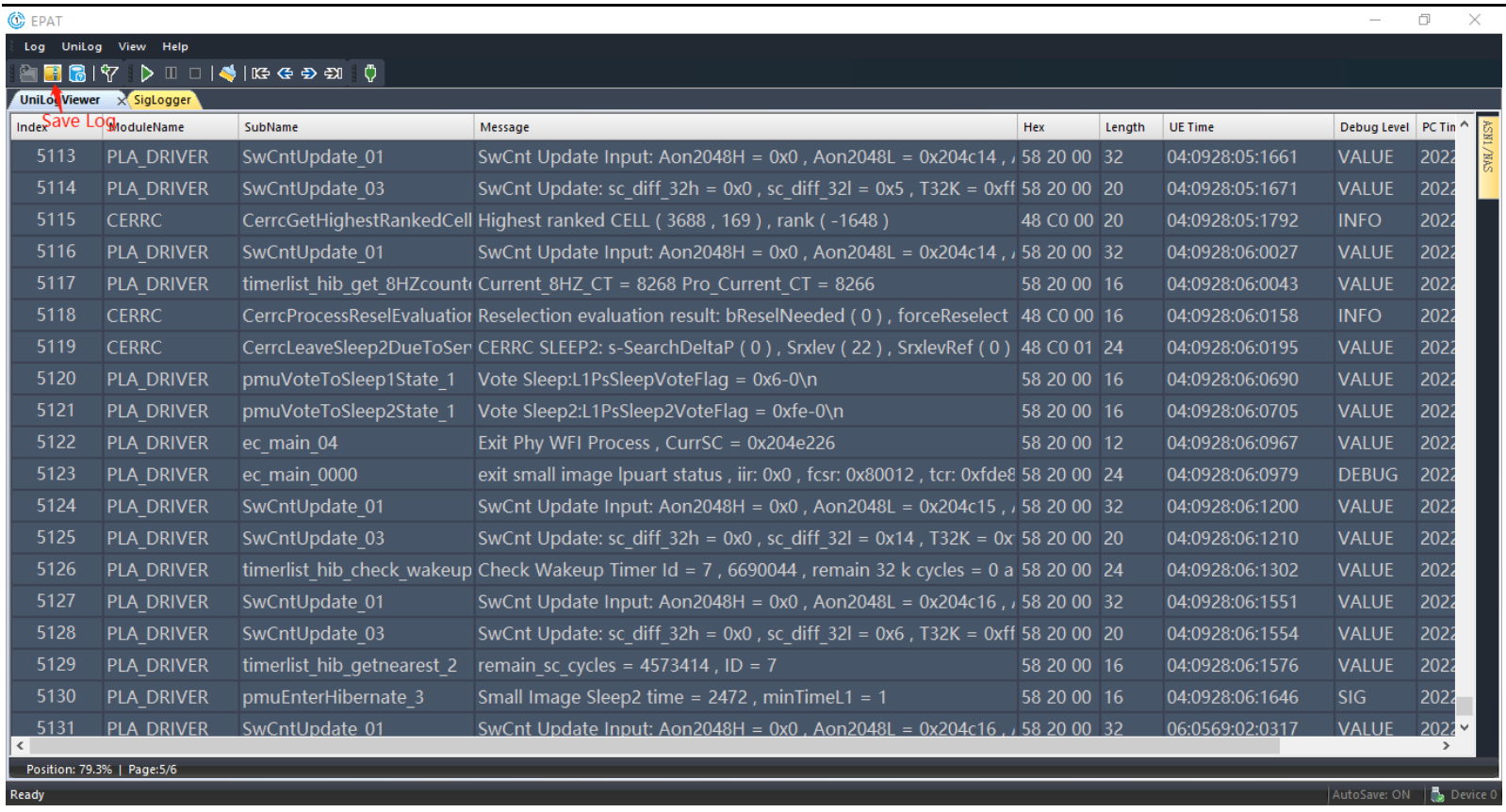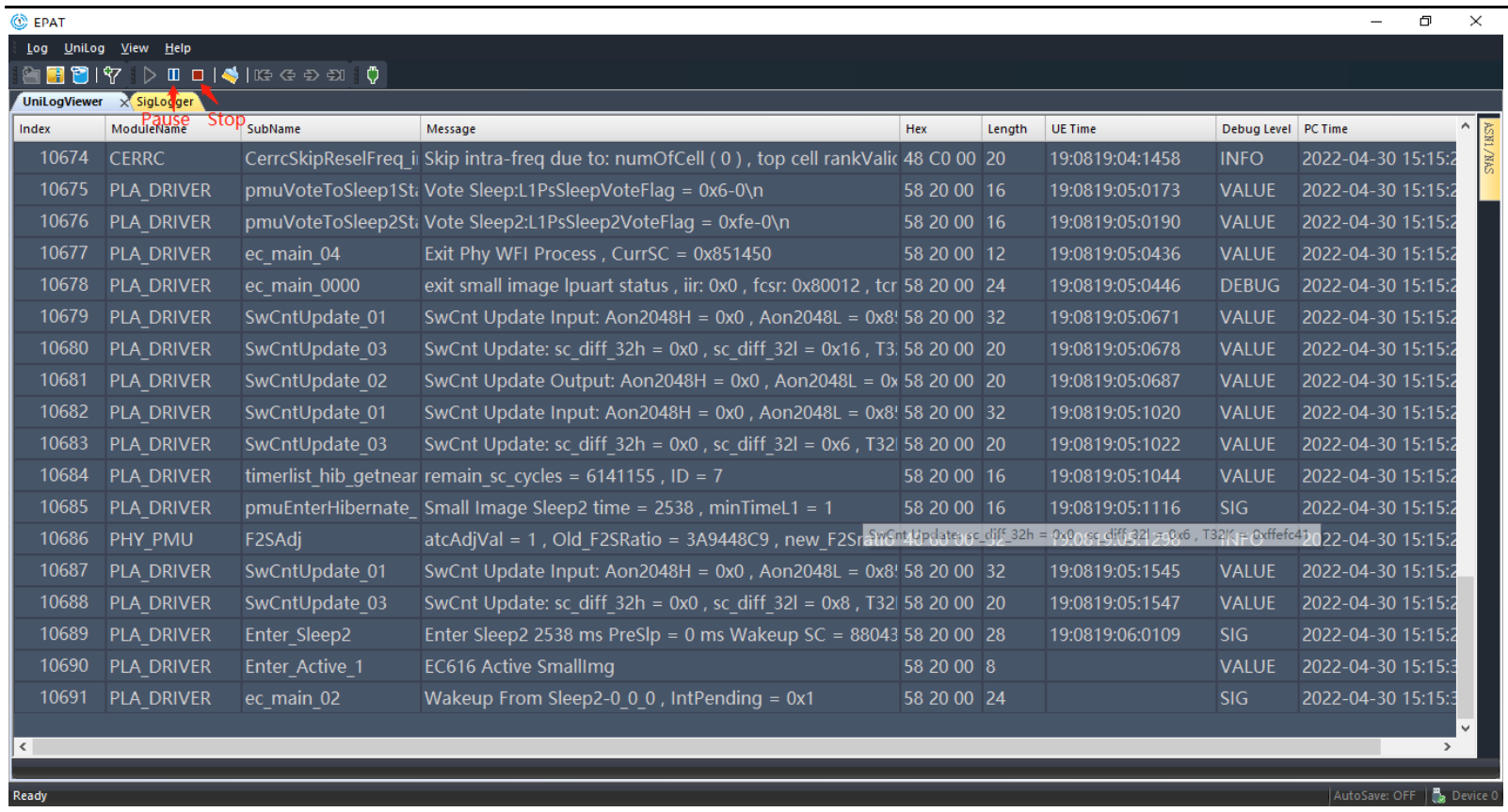If the “UniLogViewer” in EPAT only outputs Log messages as shown below, select “Log→Log Control” in the menu bar, then select “On” and click “Start” in the popup window, then to display the command, after executing for several times, re-power the module or Reset; AT+ECPCFG=”logCtrl”,2; Enable debug output;