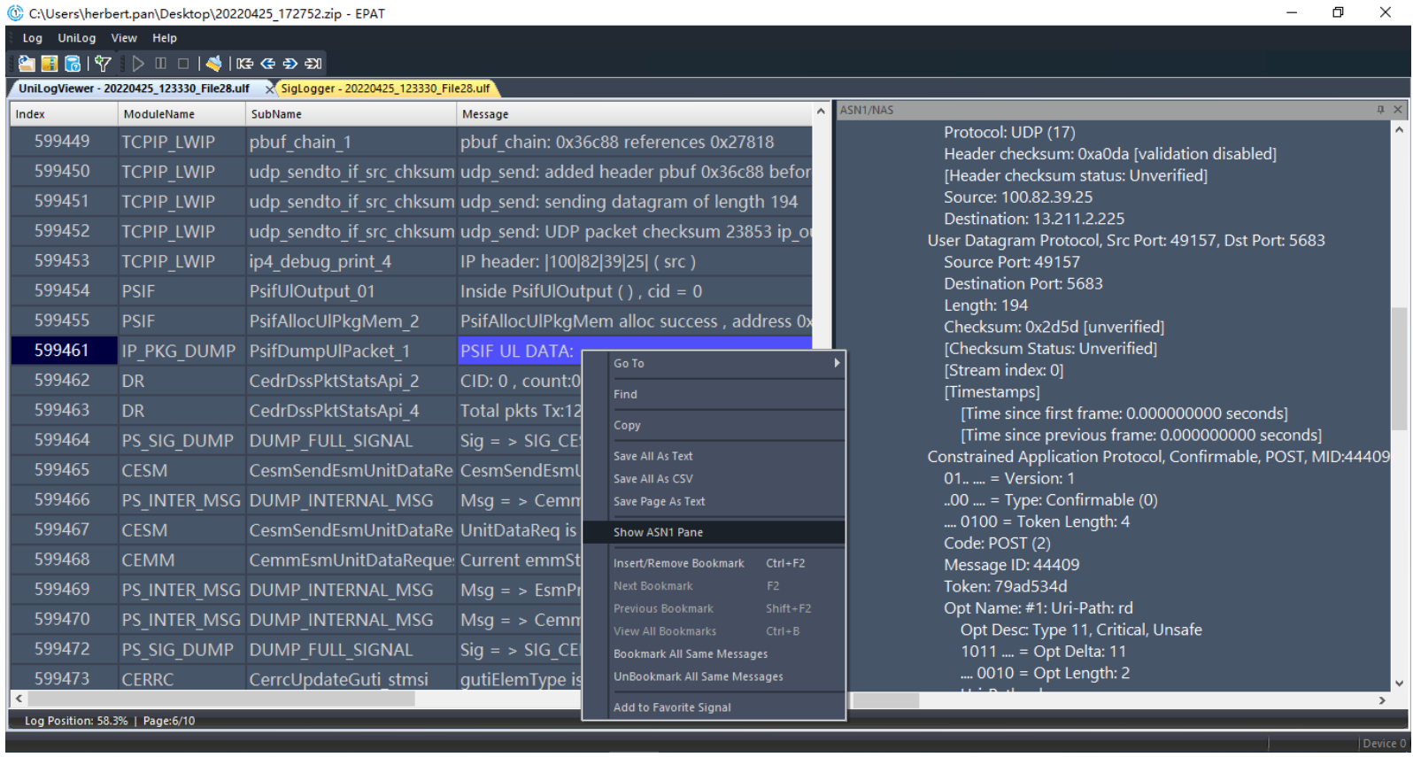 In the Uni Log Viewer window, select the ASN1/NAS type message, right click and choose “Show ASN1 Pane”, as shown below; ASN1/NAS message in messages can be parsed to further analyze data.