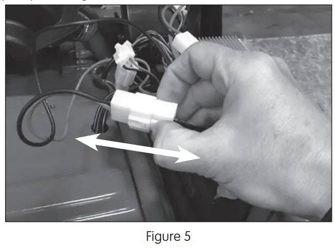 Locate the white plastic connector on the battery that attaches to the control module and disconnect by depressing the tab on the connector.