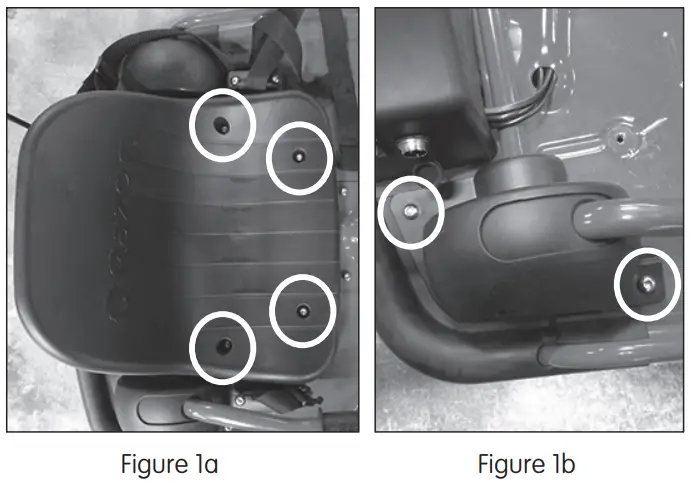 Using a 5 mm Allen wrench, loosen the four (4) hex bolts that attach the seat to the frame (Figure 1a) and remove seat. Remove the two (2) hex bolts on the Drift Bar cover (Figure 1b) and remove.