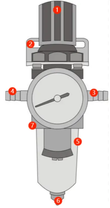 - The scale position of the meter, suggest the indicated position is 60-70 PSI(about 0.4Mpa) air pressure. When there is too much water in the filter cylinder, the drain valve should be opened to drain the water.