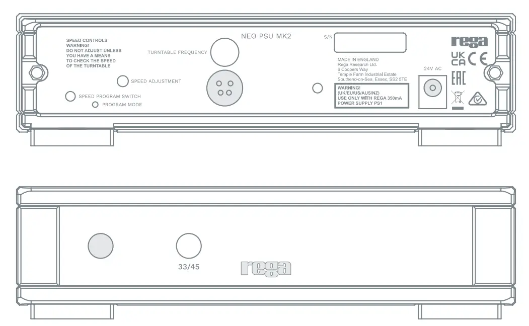 Do not unplug the power supply from the turntable whilst the unit is on – turn off the power supply before unplugging. Do not operate the power supply without the turntable connected. A 24V AC plus a 20V DC signal is present on the pins of the plug – if these are shorted it will cause damage to the power unit. Use only with the Rega PS1 power supply or Neo PSU MK2. Never expose the unit to rain or moisture. Do not open the case covers.