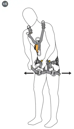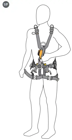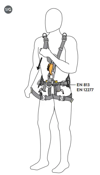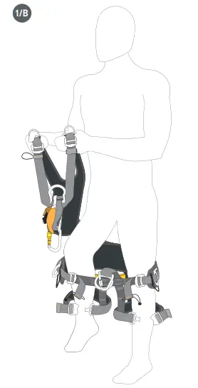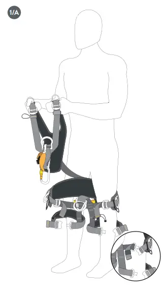 1/A. Move harness to the side and place one leg inside the waist belt and in front of the leg loop. If fitted with an openable buckle type, the belt can be disconnected for ease of donning.