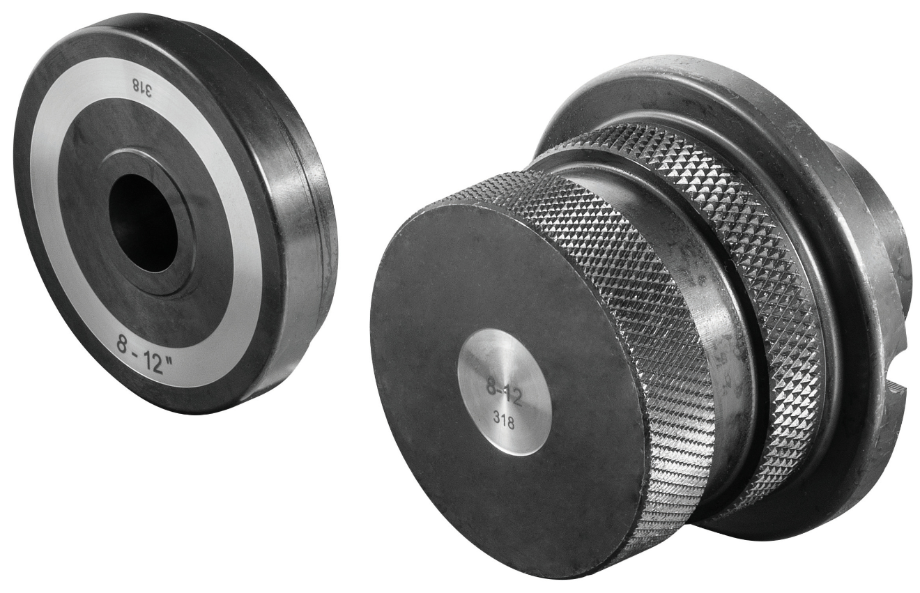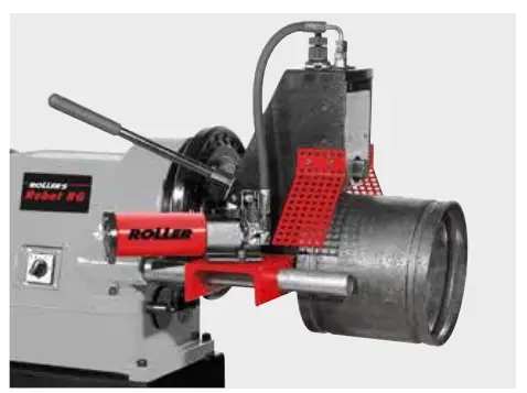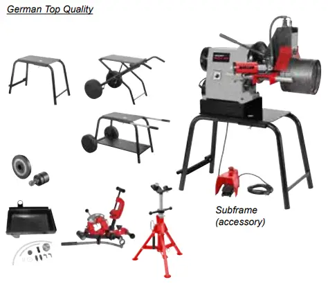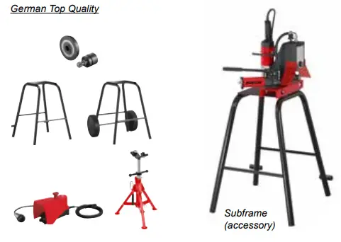 Drive unit with clamping chuck and centring chuck. Roll grooving device with manual hydraulic pump, groove depth stop, integrated setting disc, 1 pair of grooving rollers (pressure roller, counterpressure roller) 2 – 6″, allen key.