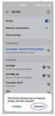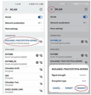 - Select the WiFi hotspot with the prefix “KCKJA**********”. 10.Click “CONNECT” to connect and once the connection is successful,