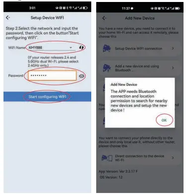 - Select your home WiFi (if not displayed, please click the double arrow on the right to refresh), enter the WiFi password (you can click the icon on the right to show the input content to ensure that the password is entered correctly), and click “Start configuring WIFI” and then “OK” to enter the camera’s connection