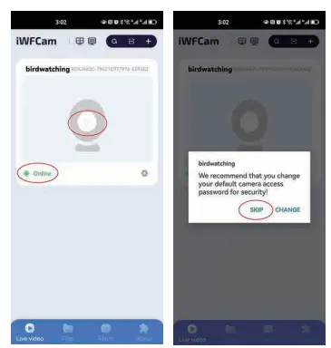 - After clicking refresh, a popup window will appear. Please select “SKIP”. The camera will display the “CHANGE” is for password modification, the camera’s default password