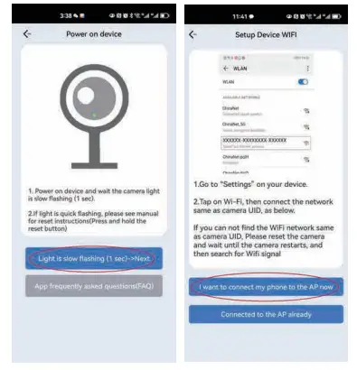 - If the camera blue light is flashing slowly, it means that the camera is ready to be connected to the network. Click “Light is slow flashing(1 sec)->Next”.