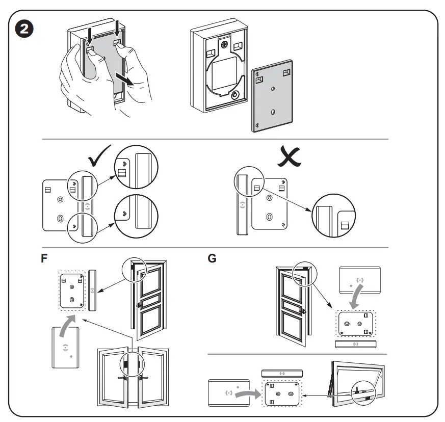 - Install the primary and secondary parts as per the suggested location: F Vertical mounting options G Horizontal mounting options
