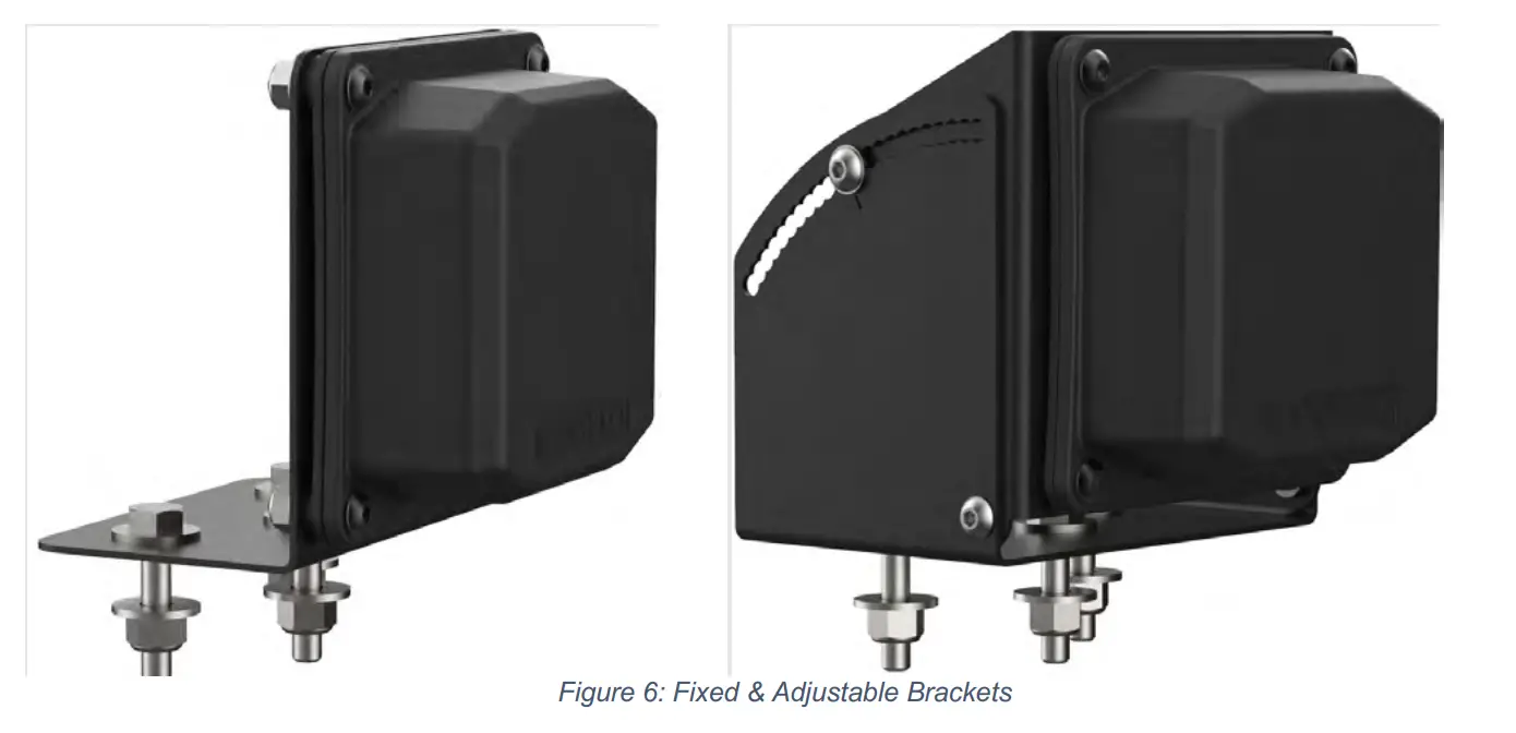 The first mounting bracket is a 90° fixed bracket that will cover most installations and is the default one that ships with the radar. If the installation requires the radar to be angled due to the mounting location, a bracket with ±21.5° of flexibility is available. Only in rare cases should the sensor be angled down more than a few degrees.