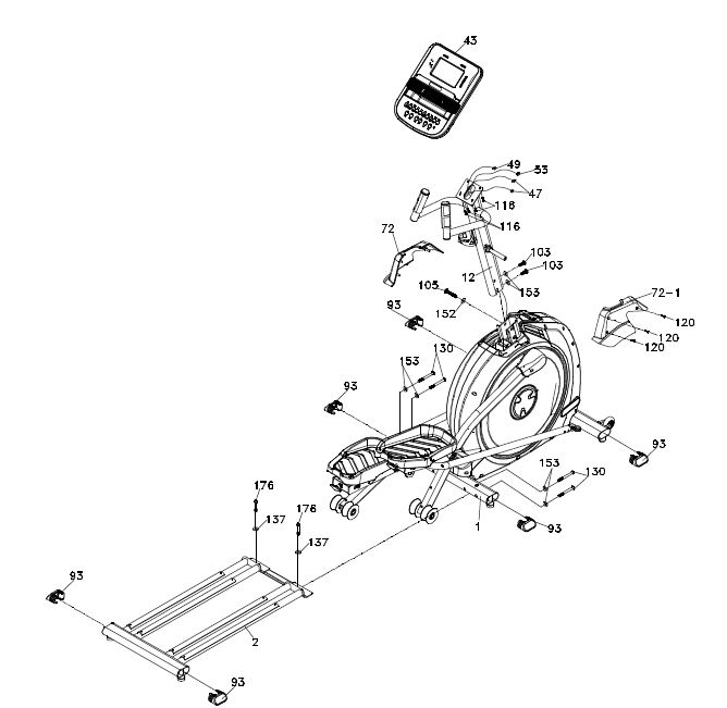 (53) to the back of the CONSOLE (43). Do not force the connectors; they will only fit one way and are different sizes to prevent confusion. Place the excessive cable in the CONSOLE MAST TUBE (12). - Attach the CONSOLE (43) to the bracket of the Console Mast tube with 4 PHILLIPS HEAD SCREWS (116). Tighten the screws using the PHILLIPS HEAD SCREW DRIVER (157).