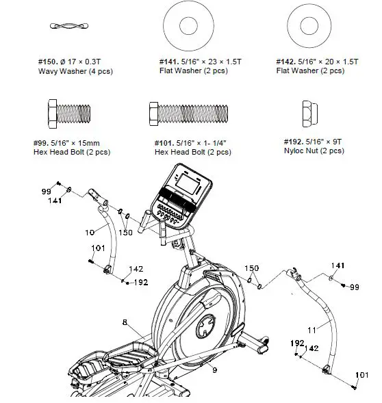 NOTE: Maybe there is one bolt already installed on the bracket that will engage with the slot at the bottom of the Console Mast. This needs to be tightened last, after the other mast bolts. - Place a SPLIT WASHER (152) onto the BOLT (105) and hand tighten through the left side of the console mast. Place a CURVED WASHER (153) onto each BOLT (103) and thread both into the front of the console mast tube. Fasten these front bolts as tight as possible with the WRENCH (155). Next tighten the two left side bolts with the same wrench firmly.