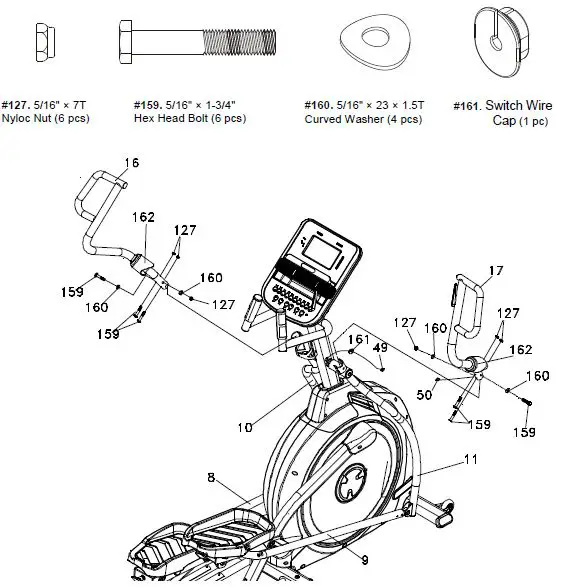 - Fix UPPER SWING ARM (17) on Lower Swing Arm (11) with 3 HEX HEAD BOLTS (159), 2 CURVED WASHERS (160) and 3 NYLOC NUTS (127) as shown.