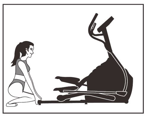 - Look closely at the four floor levelers underneath the middle and rear of the elliptical. If any of these aren’t in contact with the floor, use the WRENCH to loosen the bottom nut.