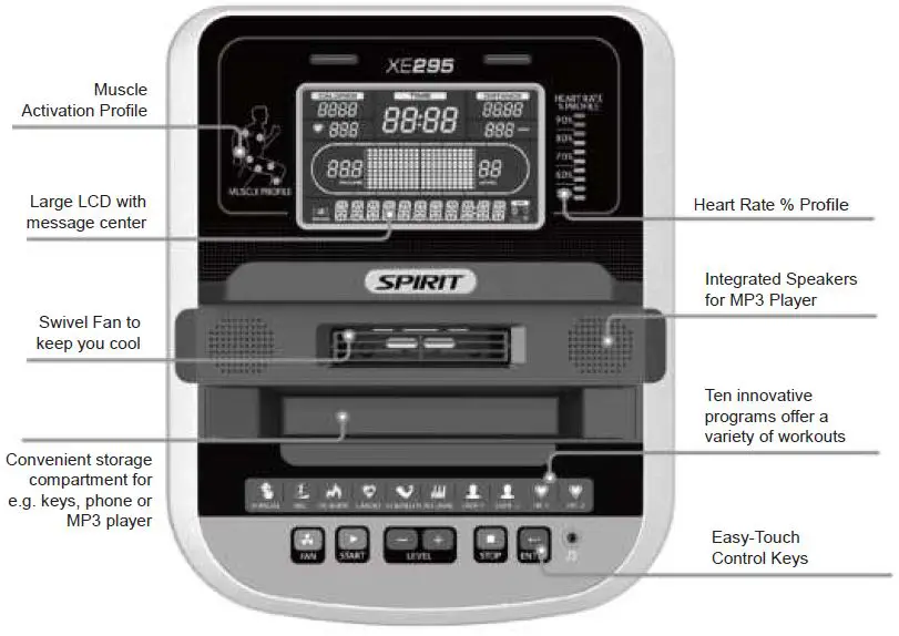 When initially powered on, the console will perform an internal self-test. During this time all the lights will turn on. When the lights go off, the Message Center will show the software version (i.e.: VER 1.0).The distance window shows the accumulated distance and the time window shows the total hours of use. After a few seconds the console will switch to startup display. The dot matrix display will be scrolling through the different workout profiles and the Message Window will be scrolling the start-up message. You may now begin to use the console.