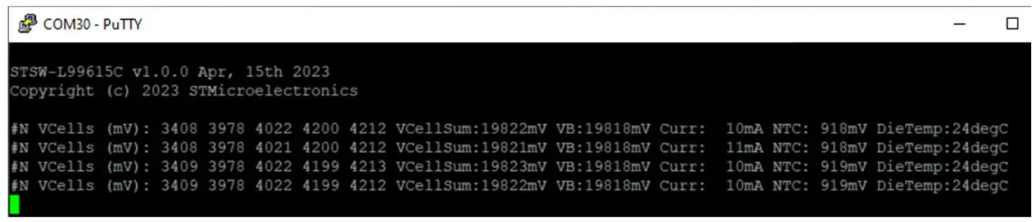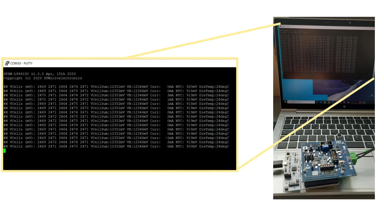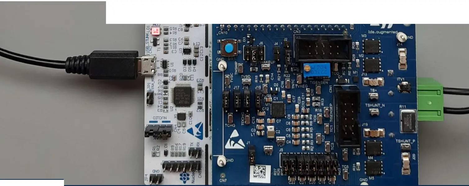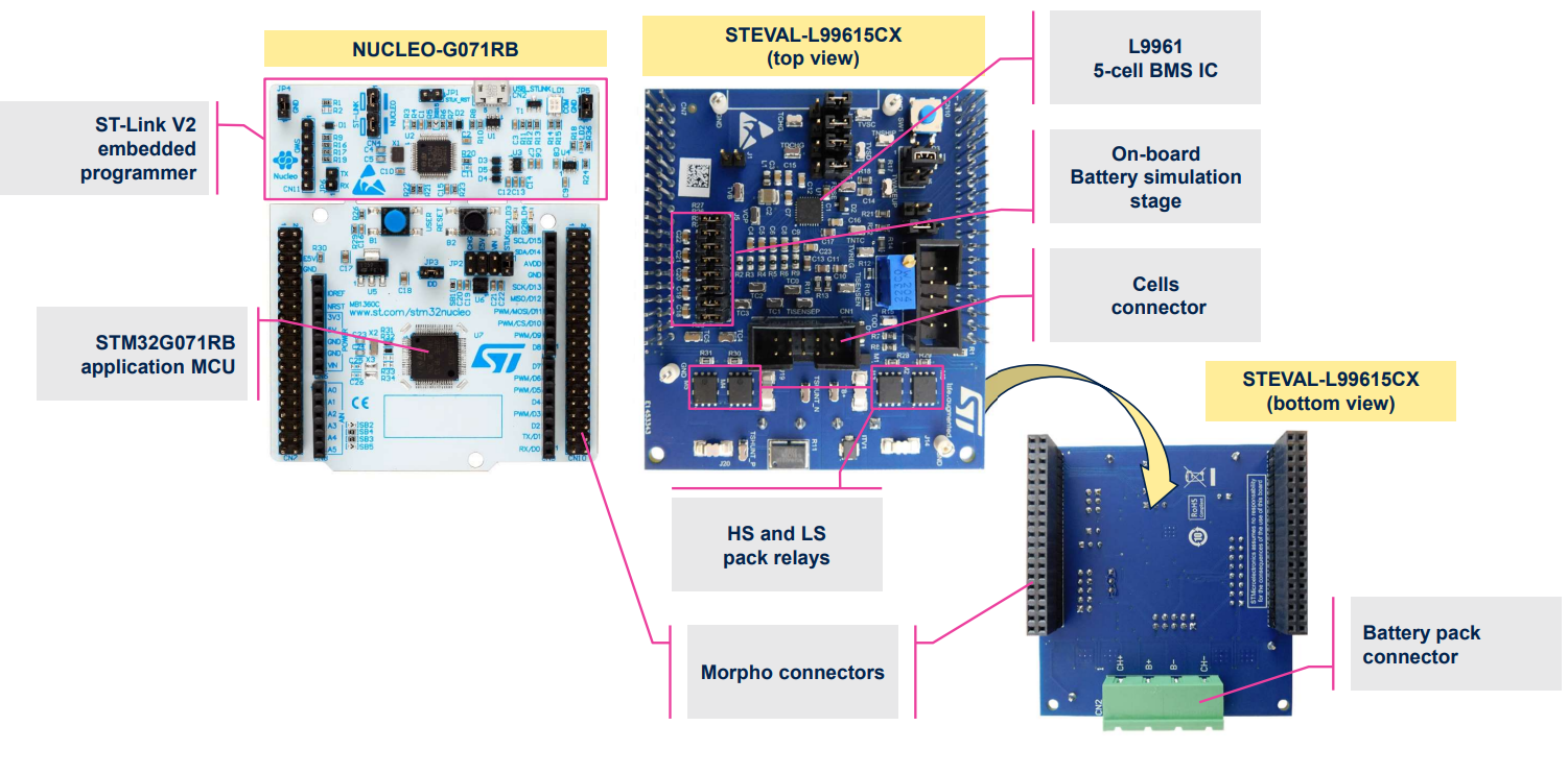 - STEVAL-L99615C: NUCLEO-G071RB development board with STM32G071RB MCU + STEVAL-L99615CX expansion board integrating the L9961 5-cell BMS IC