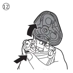 - Switch off the shaver. Disconnect the shaver. Press the release button to open the shaving unit. Pull out the Shave blades parts from the shaver . (Figure 12)