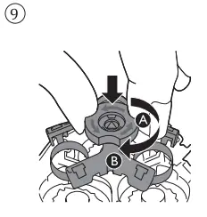 - Put the holder (B) back into the shaving unit, then turn the locking device (A) clockwise.(Figure 9)