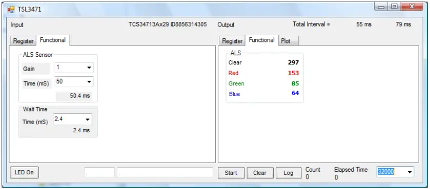 - Time (mS) – This list box has numerous preselected values for the integration time of all channels (Red, Blue, Green and Clear). If a value other than what is shown in the list box is desired it must be entered manually using the Register tab (documented later). Manually entering a value will NOT work in this location. The actual integration time is shown on the line below.
