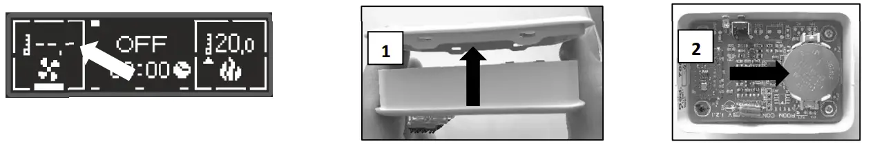 When the device stops transmitting the signal, three dashes will appear on the generator’s display (see left-hand figure below); this indicates that the battery needs to be replaced. To replace the battery, separate the two half casings of the device by applying slight outward pressure, and replace the battery. Then press button B on the Room Control again to start the device; LED A will light up for a few moments. If the room temperature is not instantly displayed above the ventilation symbol, repeat the connection procedure described in § 5. Ensure that the polarity is correct and that the contacts of the device and of the battery are clean, and if necessary clean them. The dead battery must be disposed of safely (see § 2)