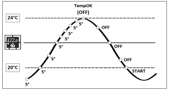 Here is an example: In this case the user selected the maximum combustion power (5th) and the room temperature of 22°C. With this configuration the generator will go to 22°C at the selected power (5th) then begin modulating. If, despite the modulation, the room temperature rises above 24°C the generator will power off. Then it will start up at the previously selected power (in this case 5th) but only when the room temperature drops below 20°C.