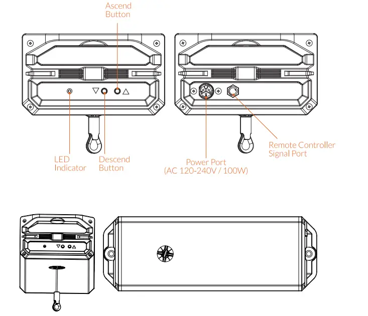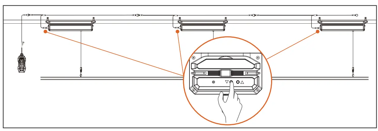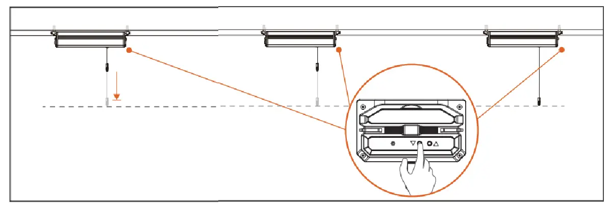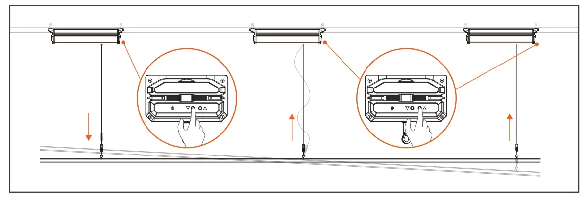 *Caution: Users are responsible to ensure all components that are connected to the Smart Light Lifter are rated properly and structurally sound. - Using the LLT-l’s descend button to individually lower the lifter’s steel cable down to the same level. While manually lowering the cable on each lifter, apply a small amount of force, or attach a small weight to make sure the cable extends smoothly from the LLT-1.*Use a ruler or tape measure to ensure they are all equal distance from the LLT-1 body.
