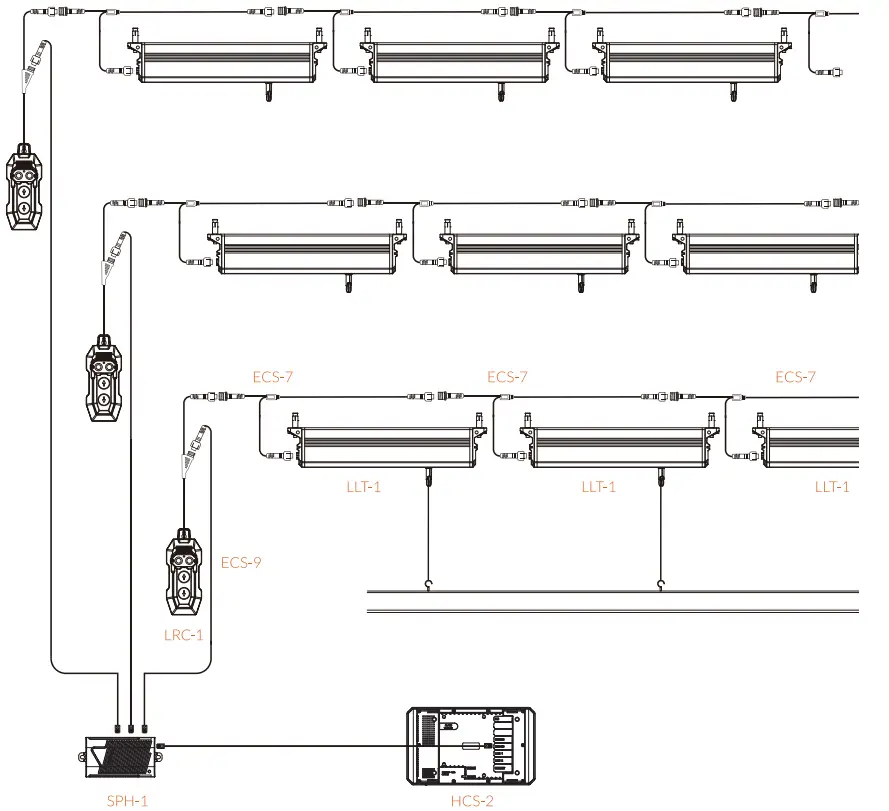 - With multiple LRC-1 remotes, you can create multiple “lifter-group”. Connect the LRC-1 remotes to the HCS-2 via SPH-1 splitter hub for advance features such as “synchronized lifter-group control”. (For more details, see Hydro-X Pro user manual and tutorial video.)