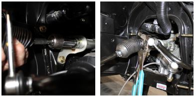 - Break the clamps on the steering rack dust boot and remove tie rod from vehicle by using a crescent wrench on inner tie rod. Keep dust boot for future use.